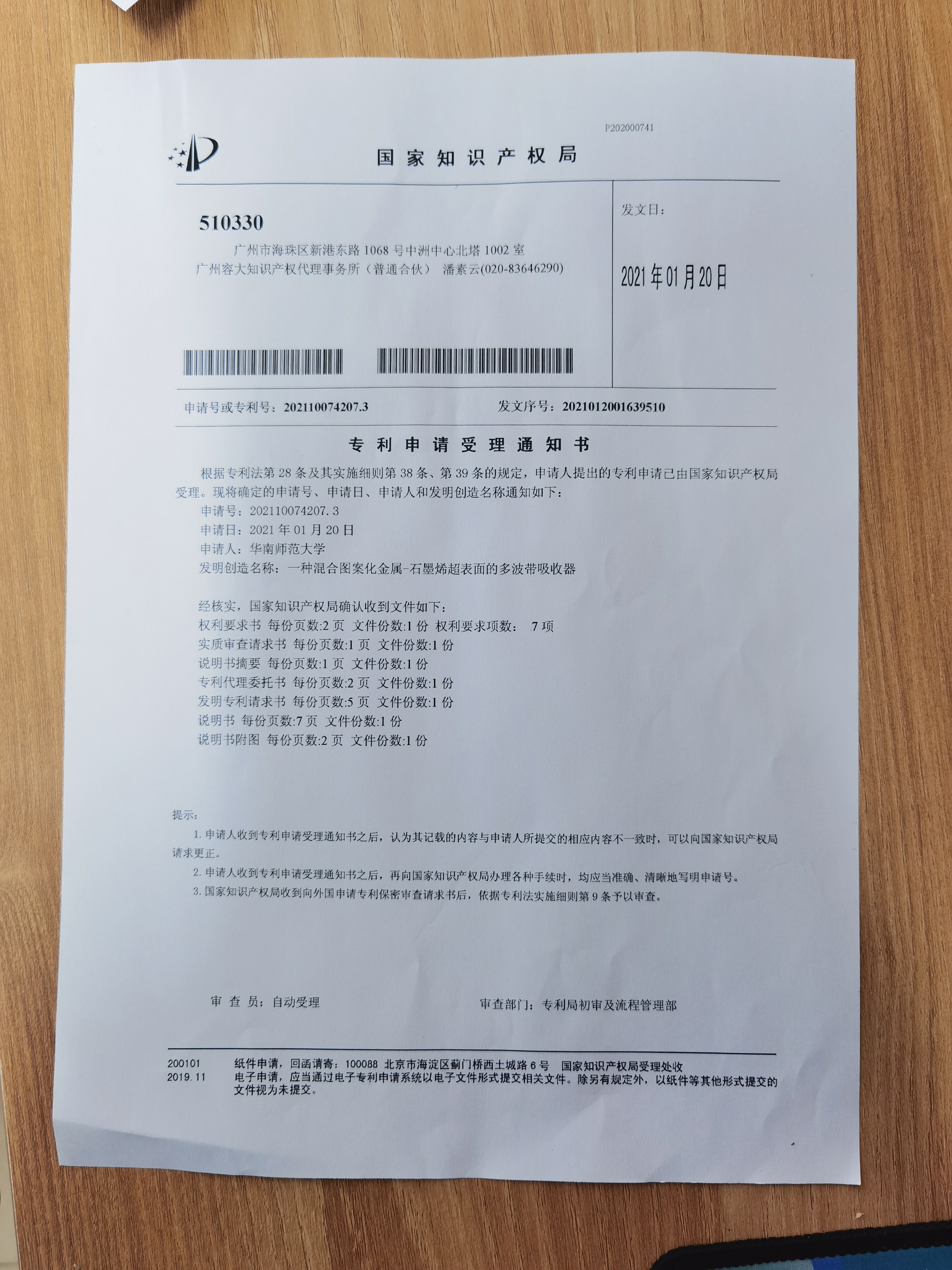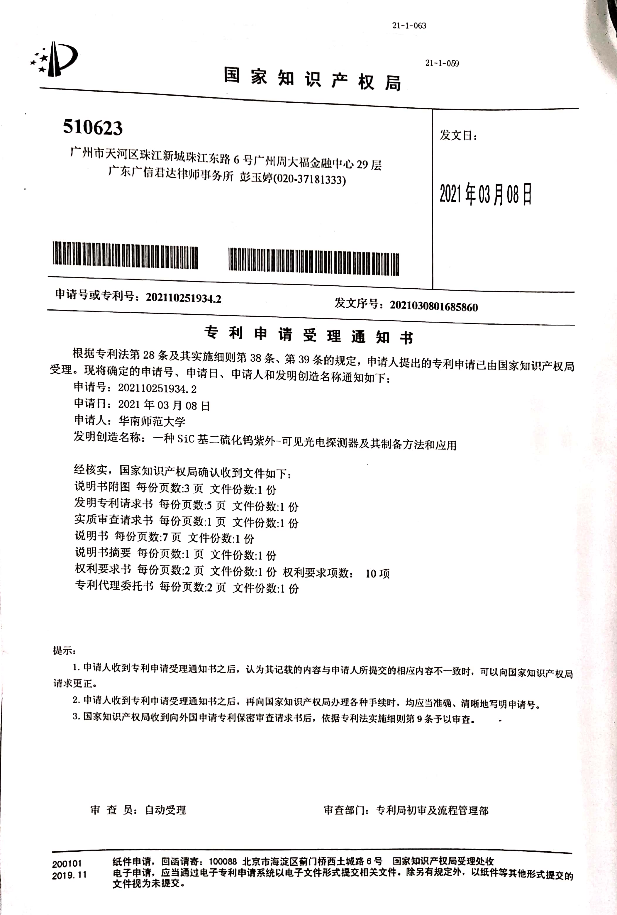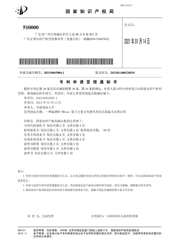 | 732-2021101600421 一种碳量子点制备方法及其图案化应用 专利申请受理通知书.pdf | CN2021101600421 |