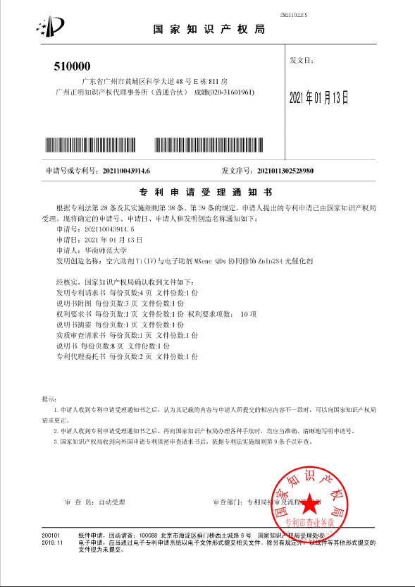 | 202110038271.6 一种拓宽钙钛矿吸光层加工窗口的方法及平面型钙钛矿太阳能电池 受理通知书.PDF | CN2021100382716 |