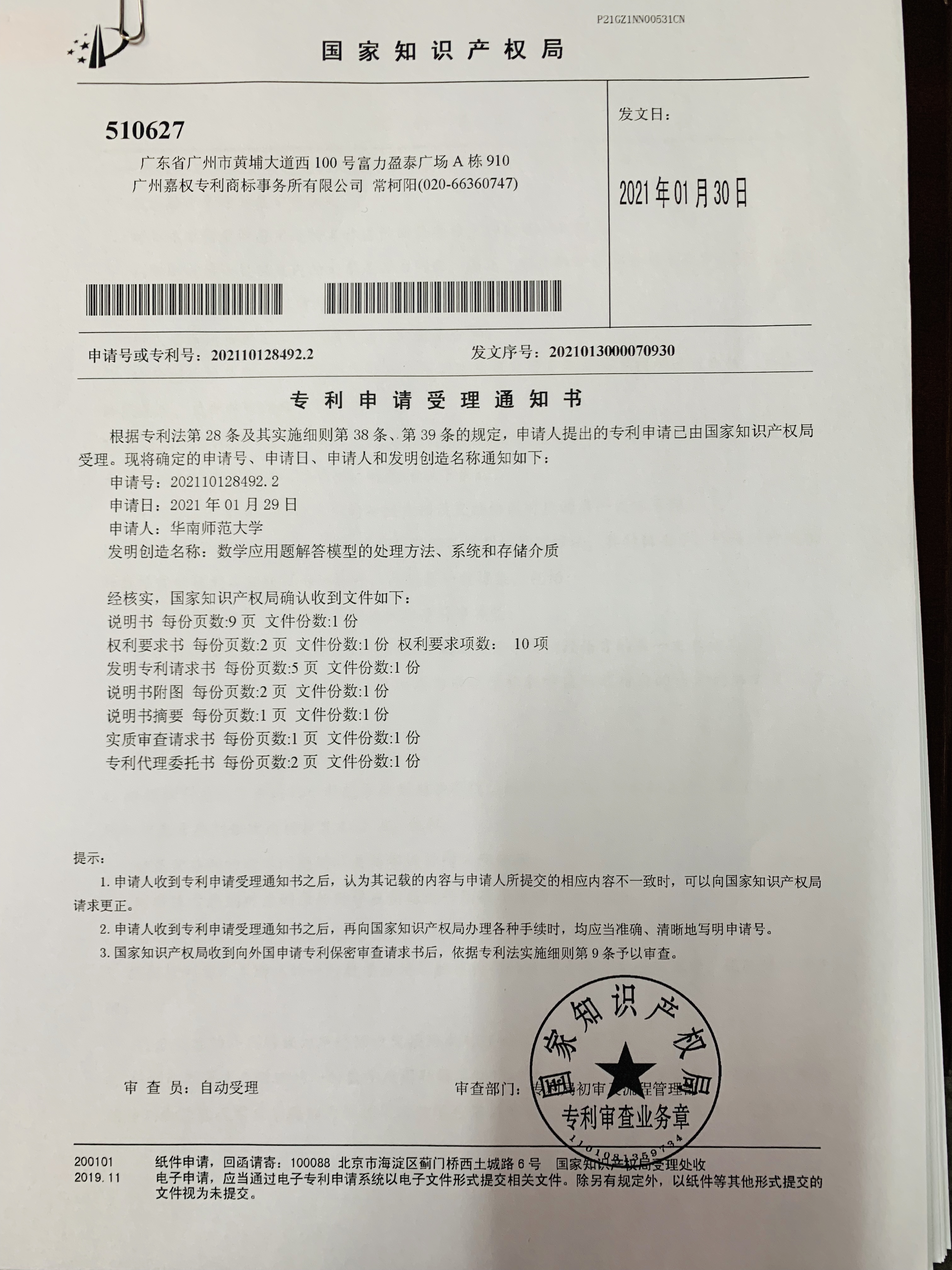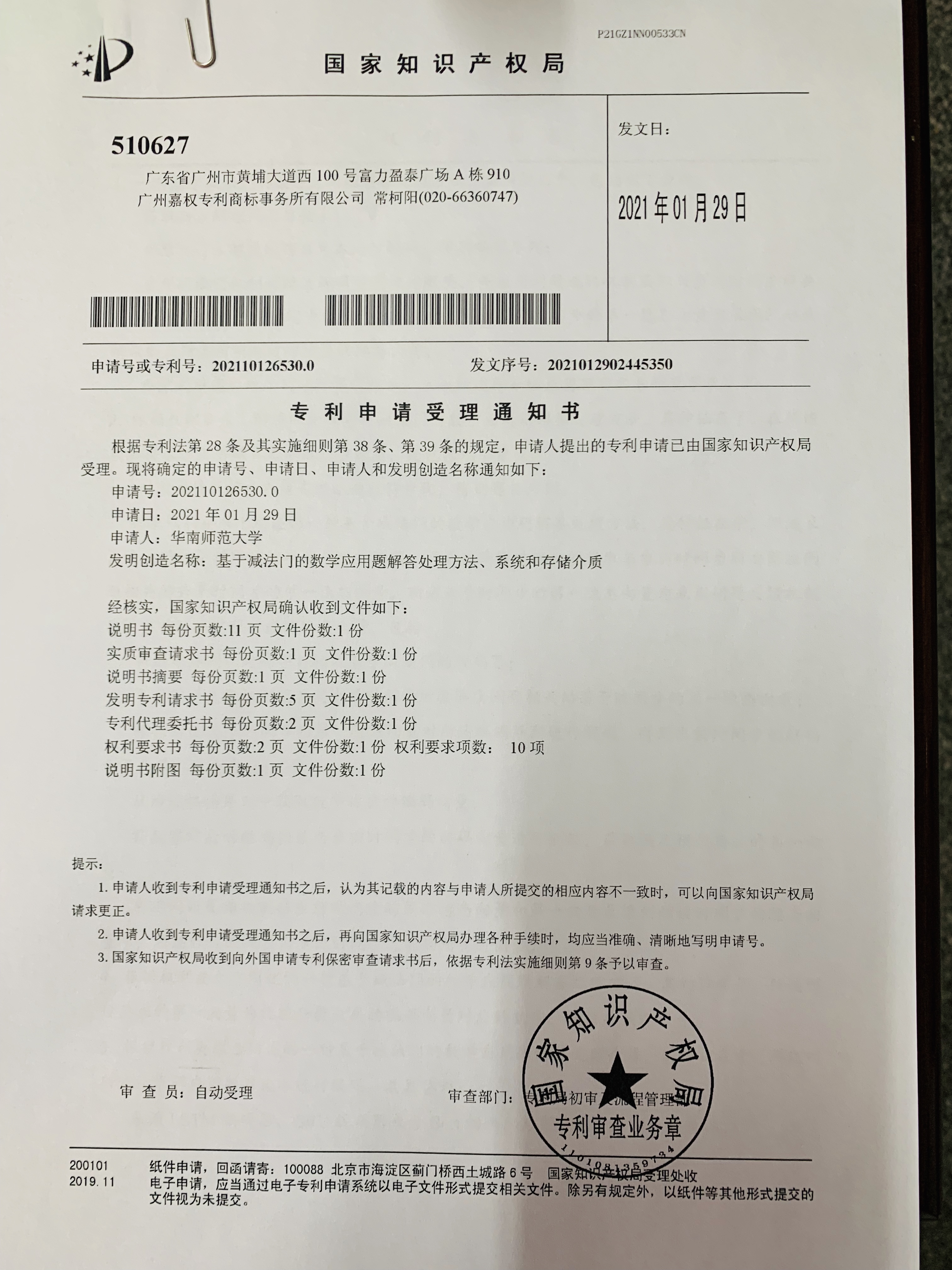 | 受理通知书-基于图神经网络的朋辈教育推荐方法、系统和存储介质.pdf | CN2021103000959 |