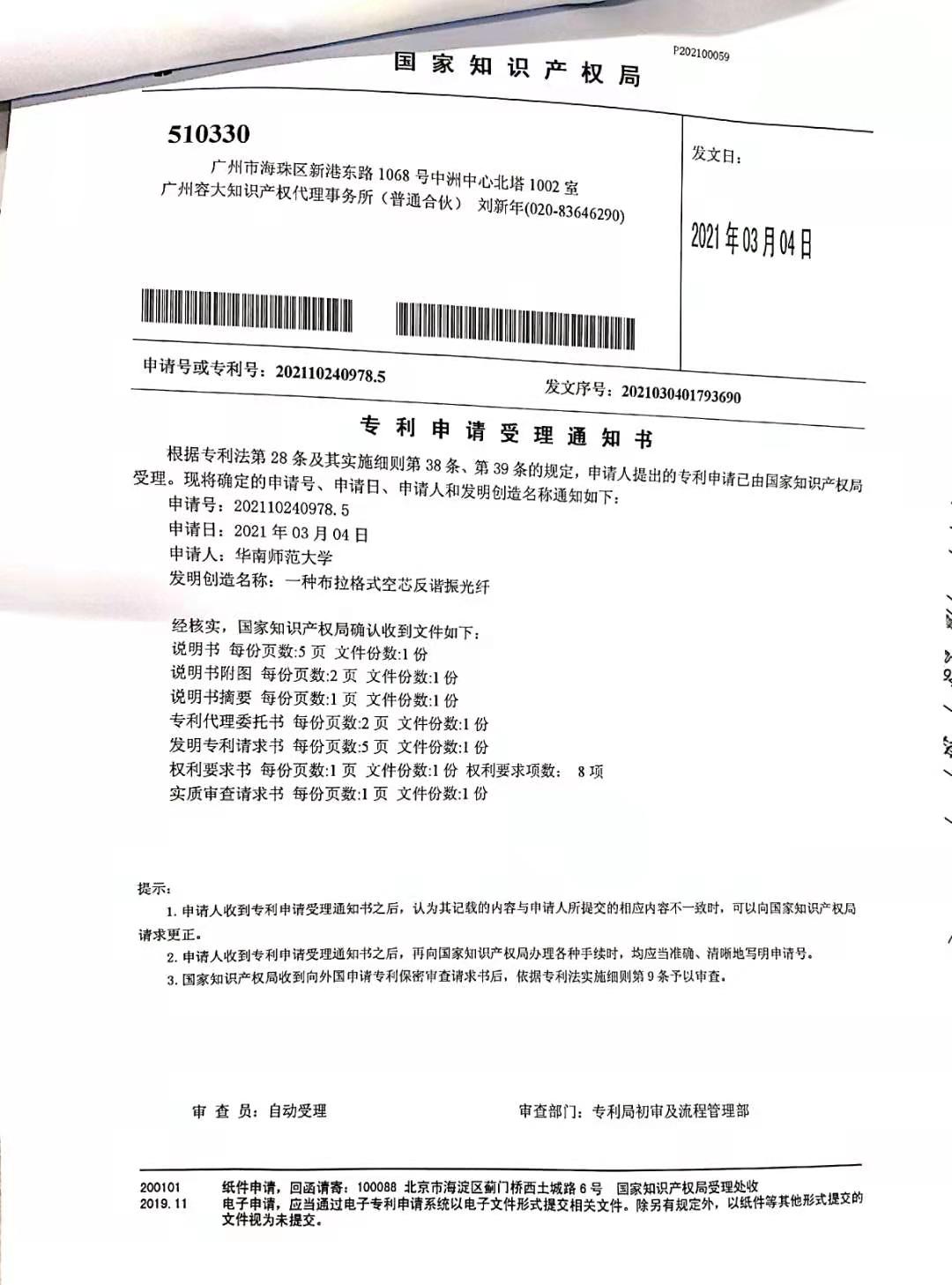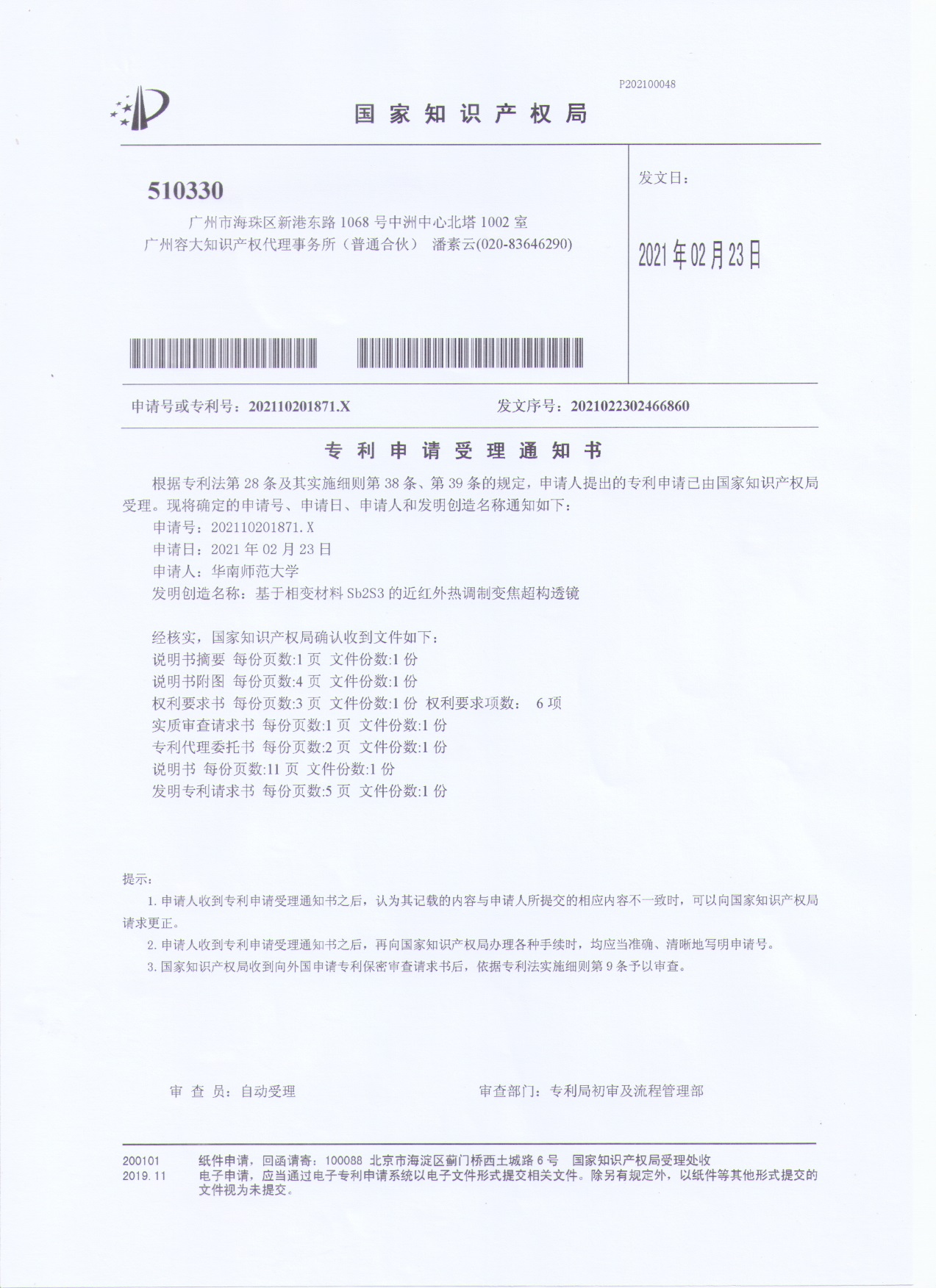 | 专利申请受理通知书(章)-金属膜上介质周期结构折射率传感器及制备方法-1.pdf | CN202110349101X |