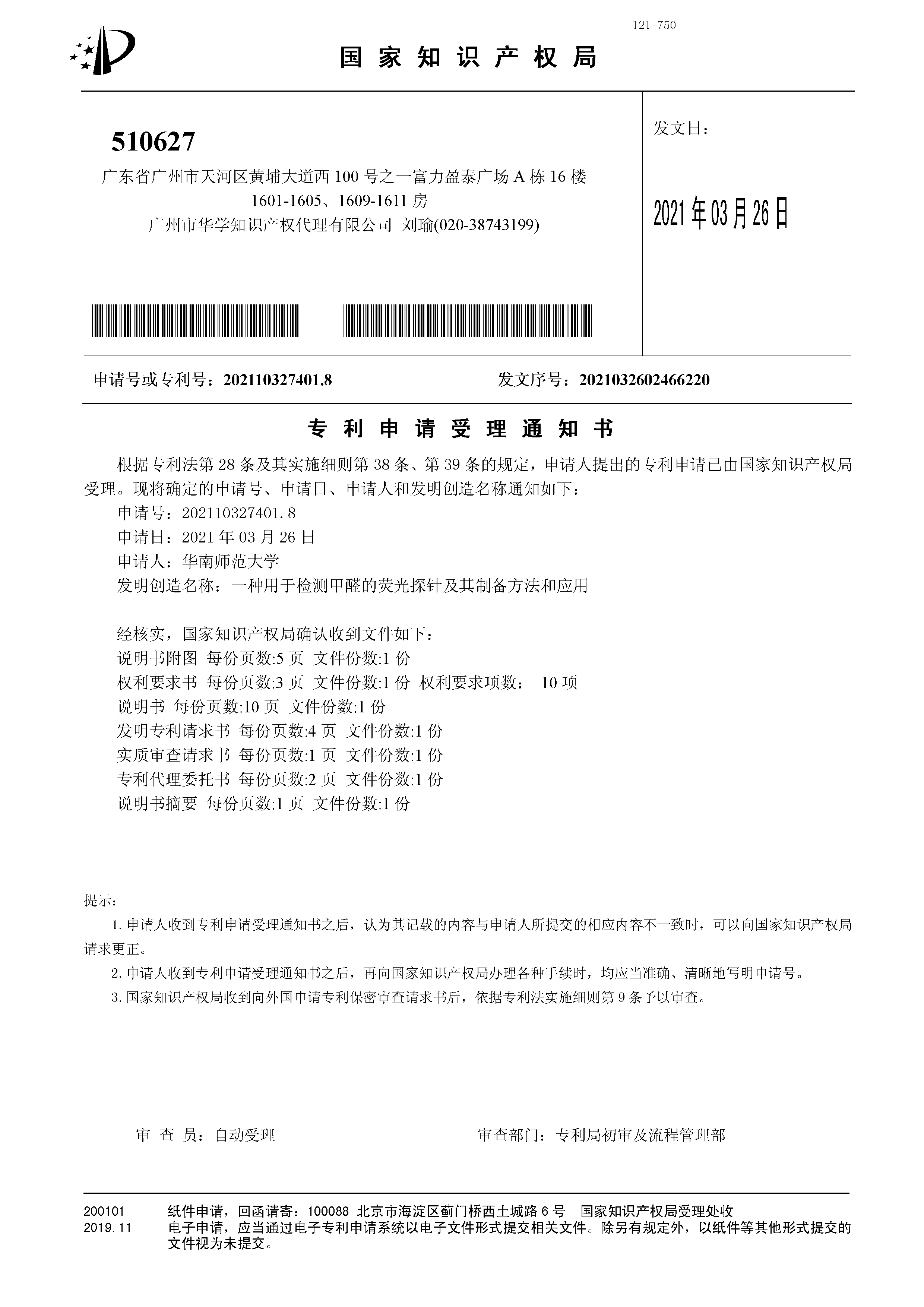 | 受理通知书——2021103677856一种检测芳香胺类VOC的MOFs荧光探针及其制备方法和应用.pdf | CN2021103677856 |