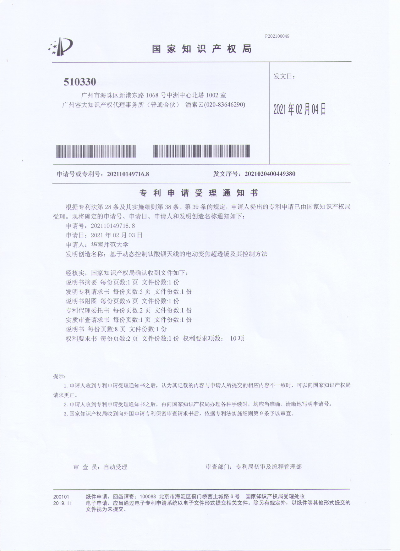 | 受理通知书-基于螺旋式快速大范围扫描的光声 超声成像装置和方法.pdf | CN2021102445508 |